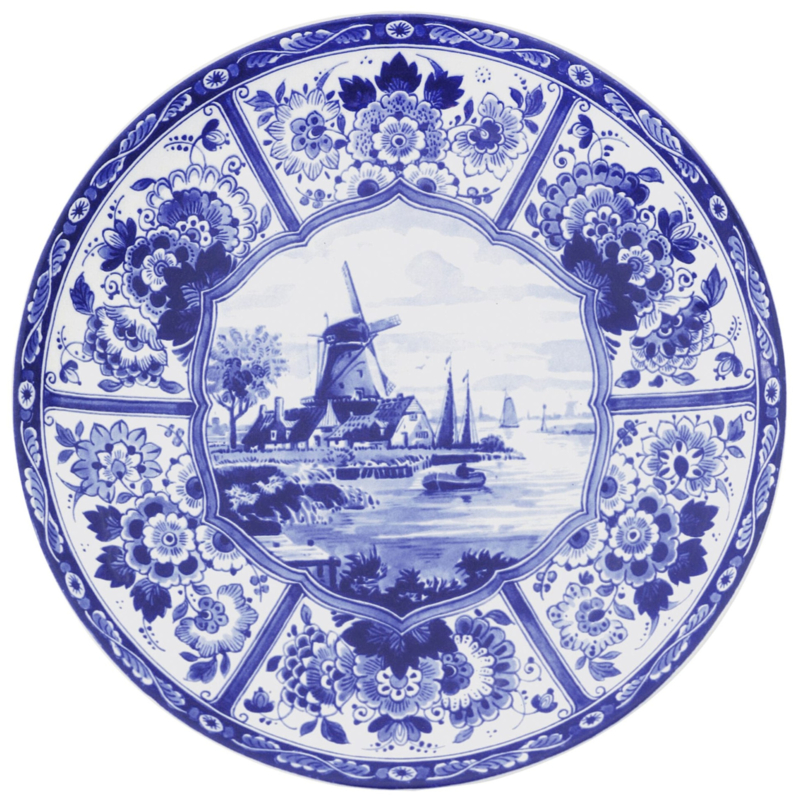 Prachtig Delfts blauw Wandbord van keramiek van het merk Royal Delft. Op het sierbord zijn bloemen te zien in verschillende tinten Delfts blauw en een Hollands landschap met molen. Zoek je een typisch Hollands cadeau van…